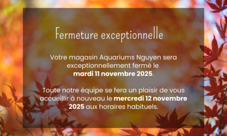 Votre magasin Aquariums Nguyen sera exceptionnellement fermé le mardi 11 novembre 2025. Toute notre équipe se fera un plaisir de vous accueillir...