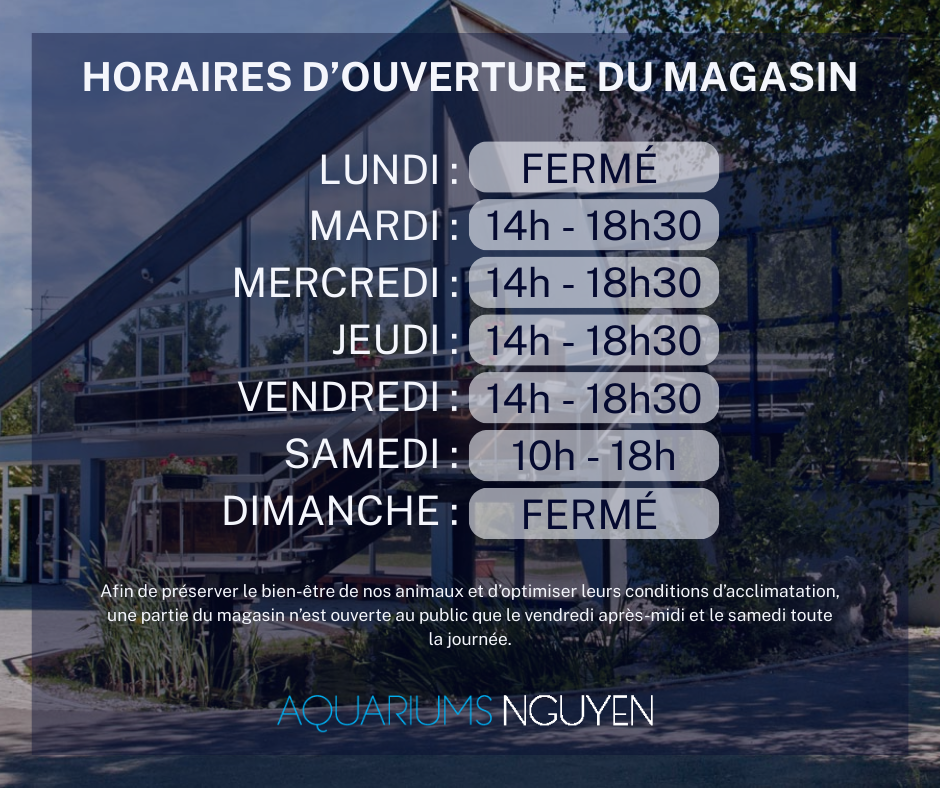 Notre magasin est ouvert du mardi au vendredi de 14h à 18h30, ainsi que le samedi de 10h à 18h. Afin de préserver le bien-être de nos animaux et d’optimiser leurs conditions d’acclimatation, une partie du magasin n’est ouverte au public que le vendredi après-midi et le samedi toute la journée.